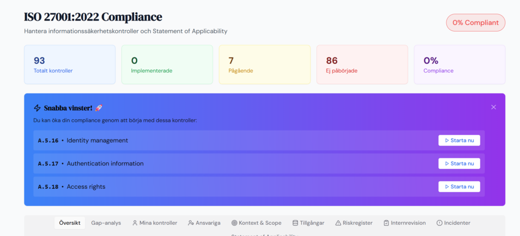 Vi har också sett flera risker med agenter och AI och har därför skrivit en specifikation Agent Identity, Trust and Lifecycle Protocol (AITLP) som ett Internet draft till IETF. Draften går att använda när du kontrollera agentic system. Utöver det bör du använda standarder som ISO 27001 som vi har byggt som modul i Sentrisk.se (se ovanstående bild)